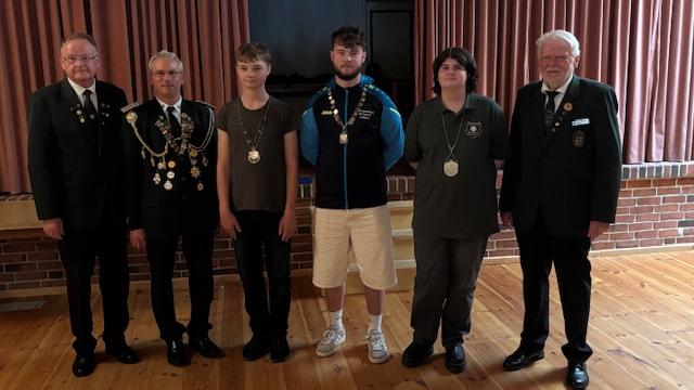 Das neue Königshaus 2025 Lasse Reents Bezirksjugendkönig SV Eiche Idafehn , 1 Adj. Ariane Bremen SV Burhafe, 2 Adj. Jelko Helmerich SV Wallinghausen mit dem Präsidenten Detlev Temmen und 1 Vize Präsidenten Gerhold Heinze und stellv. Bezirksjugendsportleiter Michael Broers.